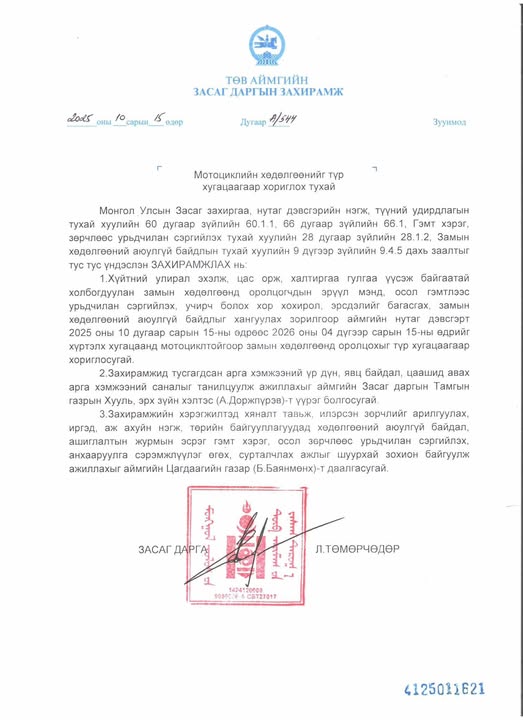 мотоциклын хөдөлгөөнийг түр хориглох тухай